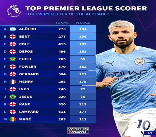 德转按球员姓氏首字母列英超历史最佳射手: